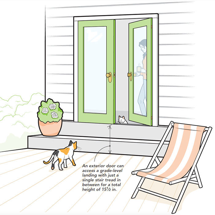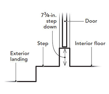 For all non-egress exterior doors, the 2003 code update allows a 7-3/4-in. step down on the interior, and up to two steps down to the landing on the exterior (regardless of which way the door swings, it can only swing over one step). This allowance provides some design flexibility. For example, by allowing two steps up to a total of 15-1/2 in., an exterior door can access a grade-level landing with just a single stair tread in between. This rule also provides the ability to drop the height of a deck ledger for increased weather resistance and ease of fastening to the house, all without requiring the space needed to build a full raised landing.