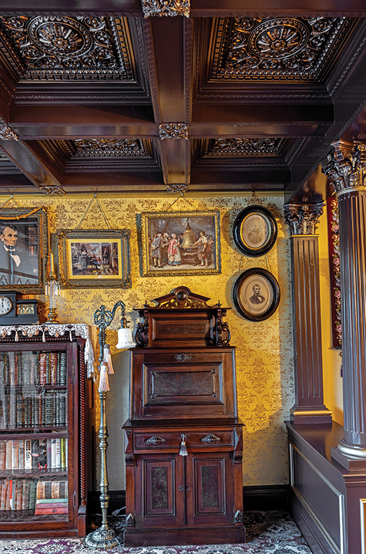 The formal solarium has a coffered ceiling and stenciled walls. Corinthian columns replaced glass doors that had blocked light.