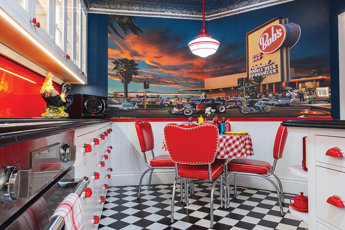Bob’s Big Boy is a popular hamburger chain that began in the 1930s and had its heyday in the 1950s in Southern California. I fell for its cheerful red-and-white checkered palette. We found the mural by artist Larry Grossman at Murals Your Way and then built out the cabinetry, tin ceiling, and tile flooring.