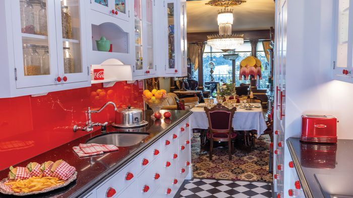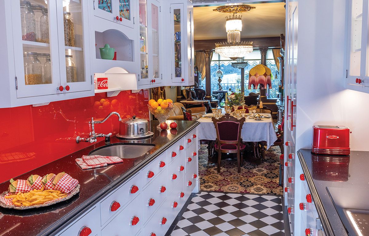 The galley kitchen’s gleeful nod to 1950s drive-ins features an extraordinary mural depicting Bob’s Big Boy, a well-known California hamburger-stand chain.
