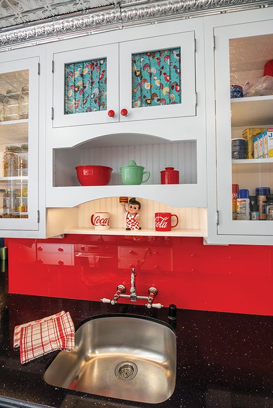 Amish cabinetmakers fulfilled Cathy’s vision of a retro kitchen, complete with a fanciful cutout shelf. The red backsplash color was matched to diner chairs and is baked onto the back of the glass.