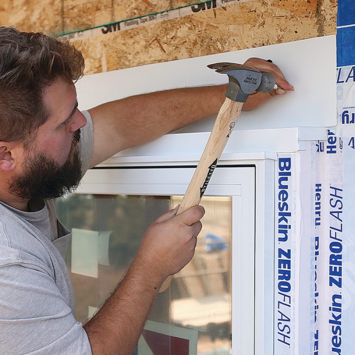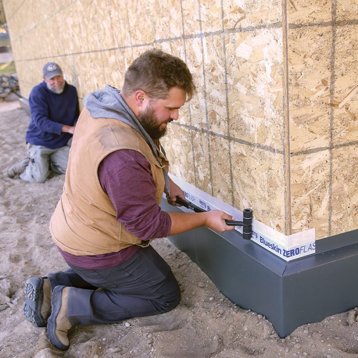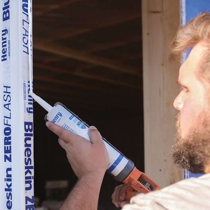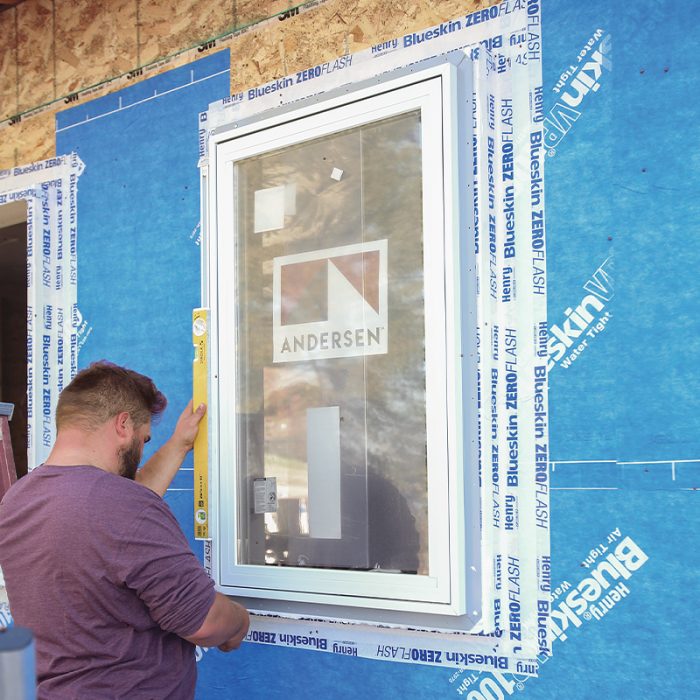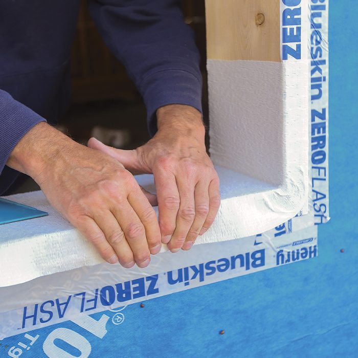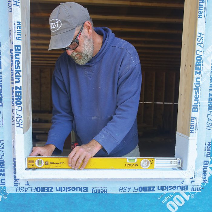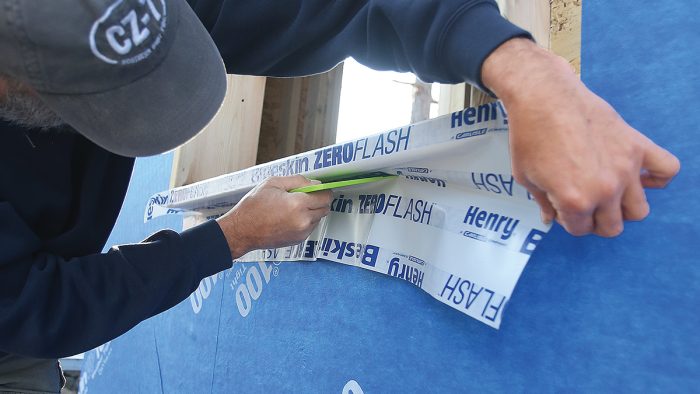 If you are going to use products from a variety of manufacturers, make sure they are compatible. For flashing on this project, I also tried one of Henry’s new tapes, Blueskin ZeroFlash. This synthetic butyl product is formulated to have good bond even in weather down to 0°F.