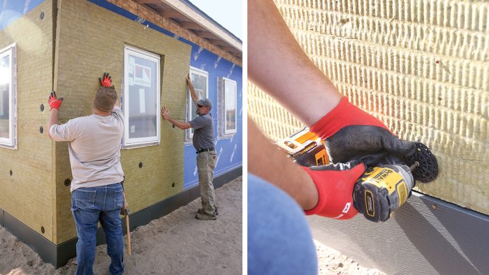 When the time came to install the insulation, we temporarily fastened the Rockwool ComfortBoard to the wall with screws and washers. It is really the 1×4 rainscreen strapping, however, that will permanently hold the CI in place. We needed the ¾-in. strapping to be fastened through the insulation and sheathing and project a minimum of 1 in. into the framing of the building. Simple math gives us fastener length, but size and spacing are based on the weight of the siding. All these specifications can be found on the Rockwool website.