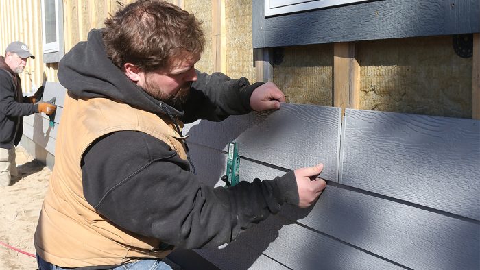 The density of ComfortBoard can make it difficult to keep the strapping flat on the wall. It is easy to overdrive the strapping fasteners and create waves in the strapping that could project through the siding. To make sure this wasn’t a problem, we adjusted the screws securing the strapping in or out, using a long straightedge and a stringline to ensure a flat surface.