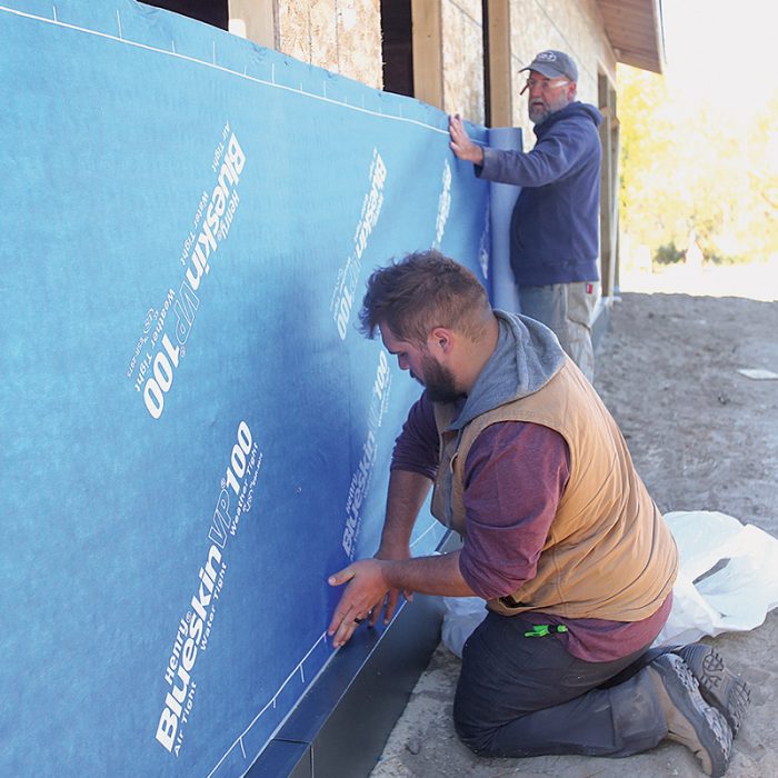 On this project, I used a self-adhered membrane, Henry Blueskin VP100, as my WRB and air control layer on the walls. Installed outside the sheathing and behind the exterior insulation, it’s protected from the homeowners and the elements. And choosing a vapor-permeable product means I don’t restrict the assembly’s drying potential. Remember, the air barrier must be continuous; the drawing on p. 31 show how I connected the air barrier on the walls to the foundation and ceiling.