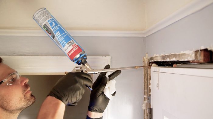 Because this is a remodel, and Habitat is maintaining the original plaster walls, we have some damage and a wider space at the top. This will all be hidden by trim, but I still want to make sure I get as much foam in there as possible to fill all the voids. Again, don’t worry about applying too much product because squeeze-out is easily cut back after it cures and you’ll be ready for trim.