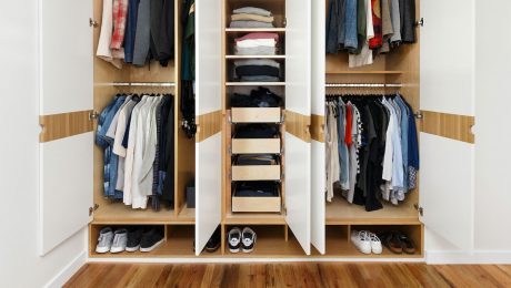 A bedroom wardrobe remodel offers multipurpose storage with built-in shelves, pullout drawers, and poles of various lengths and heights.
