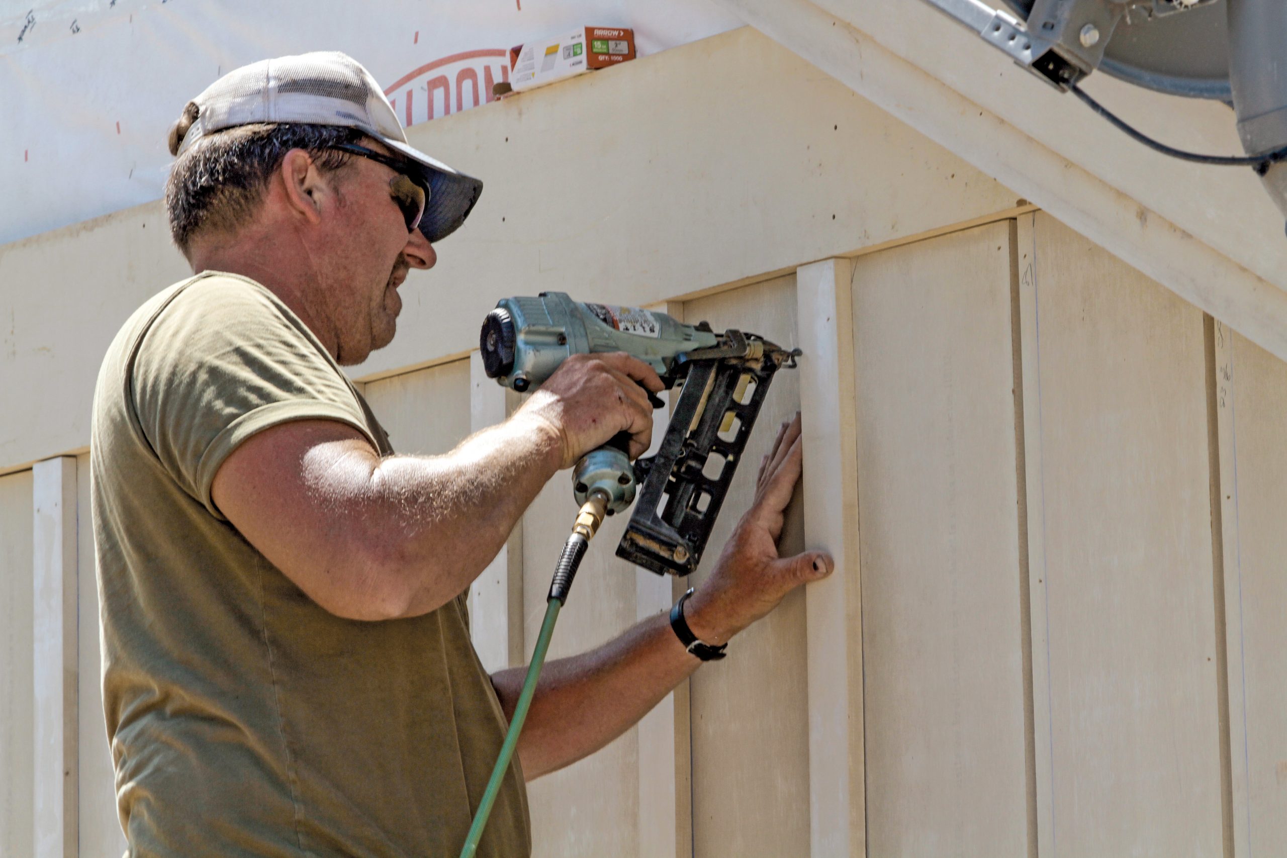 Our TruExterior supply rep recommended fastening the boards and battens with 15-ga. stainless-steel trim nails long enough for 1-1⁄2 in. of penetration into the sheathing. Nails for board and batten are typically larger than that because they have to resist the movement of wood. Poly-ash material is inherently more stable than wood, so, as the supply rep said, “We don’t really need the help of a fastener to keep it from moving.”