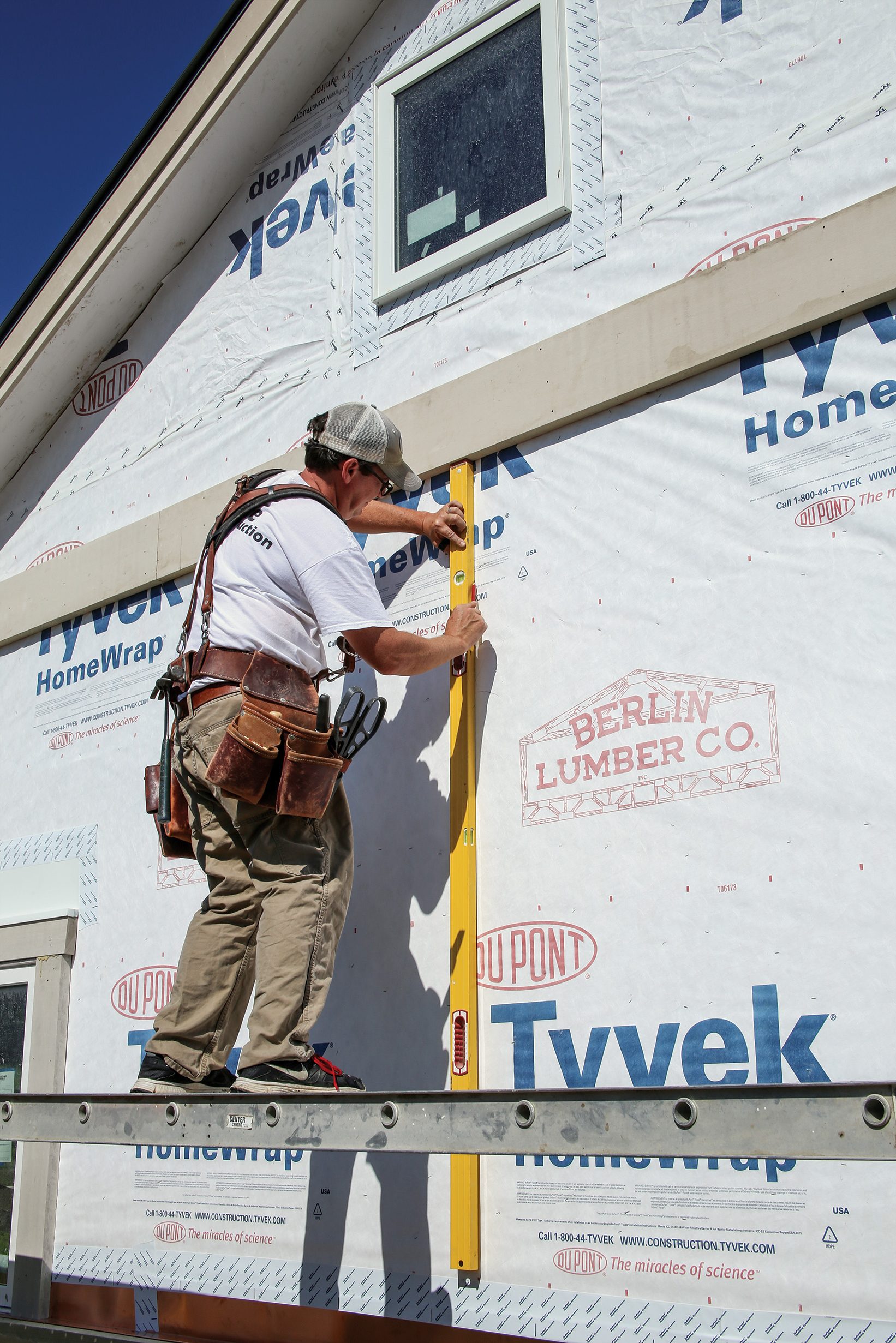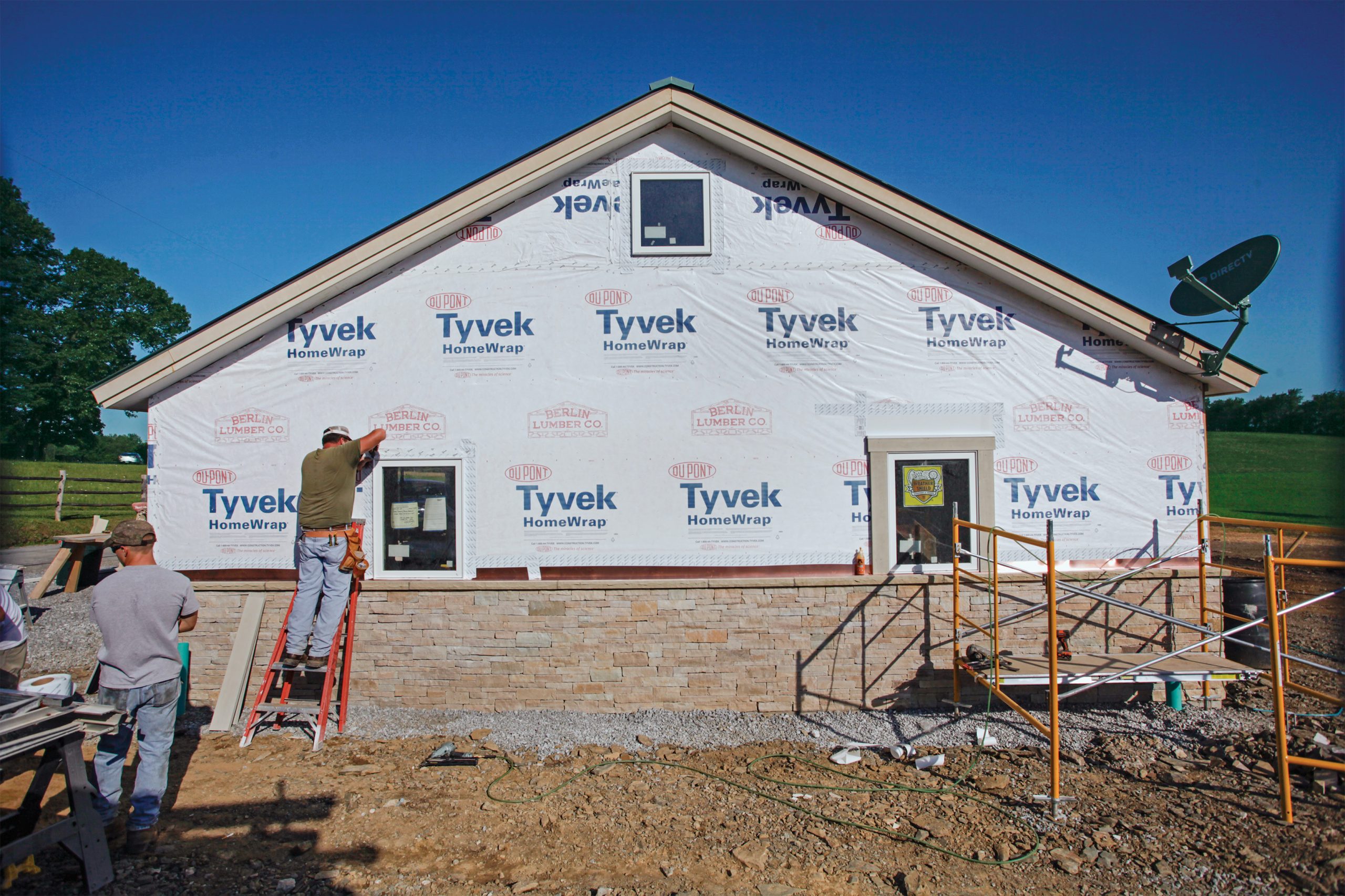 Whether we’re using wood or engineered materials like the Boral TruExterior poly-ash trim we used on this project, we prepare a wall for board-and-batten siding the same way we would for any type of siding. We cover the building in house wrap, and then flash and trim out the door and window openings.