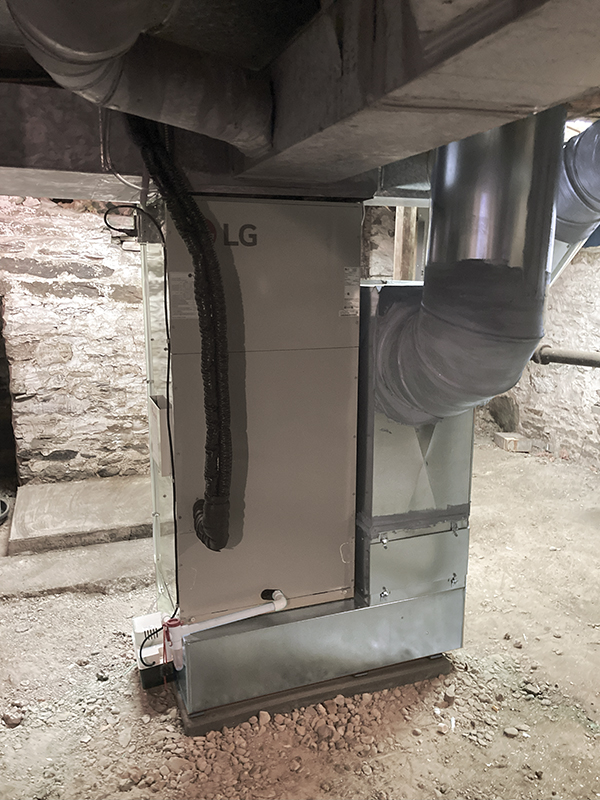 Centrally ducted, mixed ducted/ductless, and two ductless-only options were considered. A centrally ducted system was ruled out due to the lack of existing ductwork and to avoid efficiency losses associated with ductwork in the unconditioned basement. In addition, post-and-beam construction would have made running ductwork in the cavity between the first and second floors difficult.