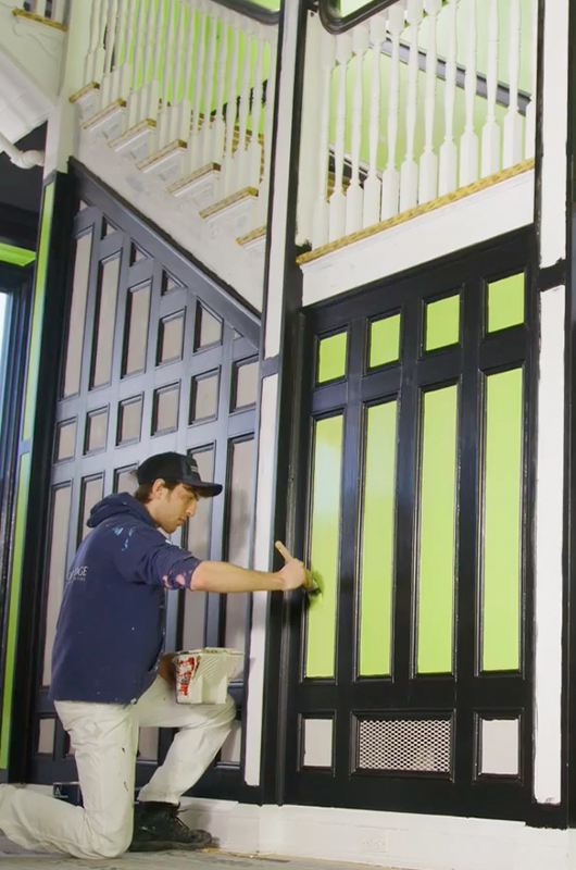To carry the theme throughout the rest of this building, we’re taking that same green and putting it on the walls all the way down the staircase into the entry foyer so that when people enter this building, they’re wowed with that same electric lime green.