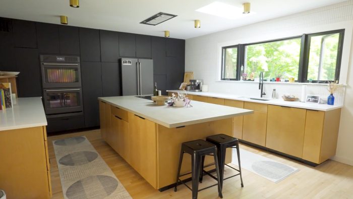 The kitchen is one of my favorite spaces in the house. We did a mix of two types of cabinets. The lower cabinets, on either side of the house and the island, are all stain-grade maple with a concrete island top. The crowning jewel is the back wall, which features full-height cabinets in matte black. These cabinets go from floor to ceiling and create a stunning look.