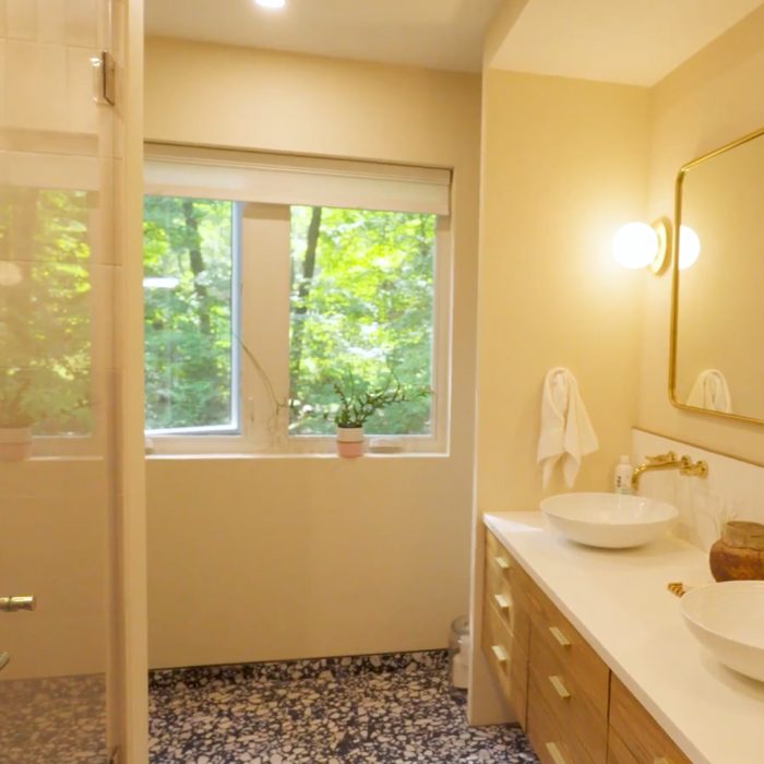 One of my favorite spaces in the house is the primary bathroom. It’s a generous size, about 9 ft. by 9 ft. The floor features 24×24 black terrazzo tiles. Continuing the vertical theme, the shower has stacked vertical tiles.