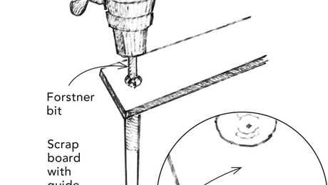 Locate Baluster CentersA simple scrap-board template and a Forstner bit makes accurate marks for drilling.