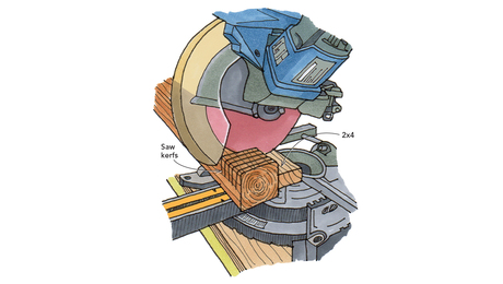 Fence Extender for Half-LapsA 2x4 in front of the miter-saw fence holds out the stock so the blade can pass all the way through.