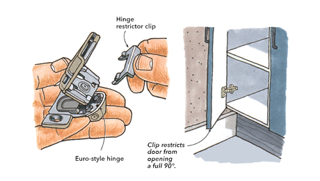 Stop the SlamHinge restrictor clips prevent cabinet doors from opening past 90°, keeping them from marking up nearby walls.