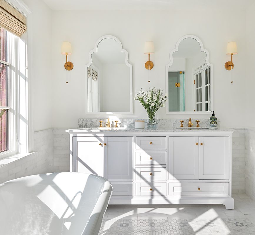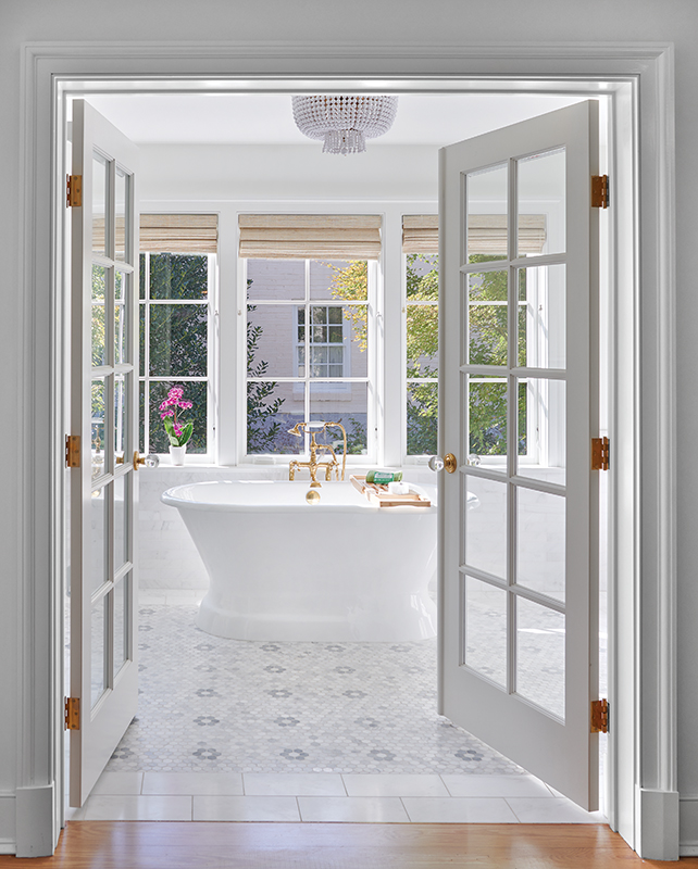 Upstairs was more a quagmire to dredge. Not only did the owner want to find room for a guest bedroom between the primary bed and bath, but she also wanted to eliminate the awkward level change between them. This meant raising the floor of the entire rear half by over six inches. “We were fighting for quarters of an inch,” says Michael. The fight was worth it: With another line of grand windows, a statement tub at center, and French doors, the primary bath is now a light well that shines through to the rest of that floor.