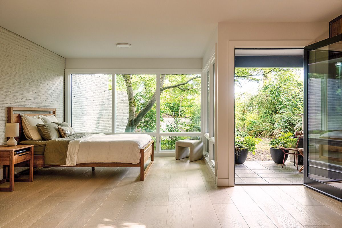 The renovation moved the primary suite to the lower level, where it overlooks a private sunken garden. The project also brought sustainability upgrades—added insulation, efficient heat pumps, and high-efficiency windows—while preserving the home’s original design.