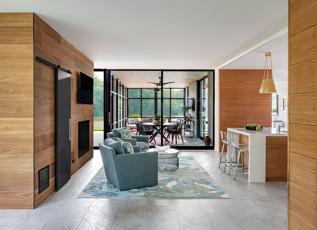 “The flow from entry portico through to the screened porch and the pond accentuates the connection between the house and its homage to nature,” says architect Jim Rill. The ceiling fixture is from Allan Knight. ©Allen Russ / StudioHDP