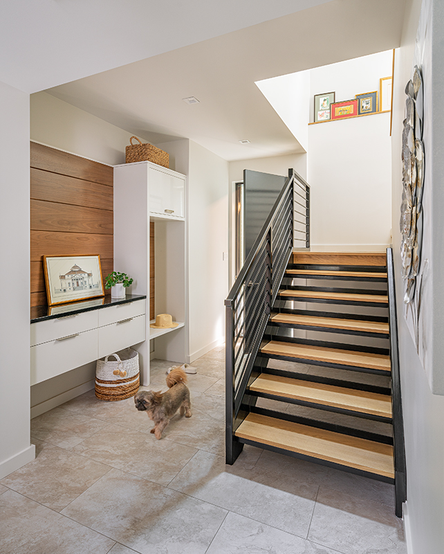 A closed-stringer, drywall staircase was replaced by one more in keeping with the Modern aesthetic. Two dogs live here: Gilbert and Sullivan. ©Allen Russ / StudioHDP