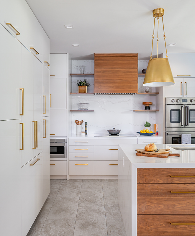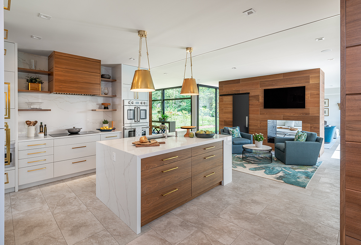 With new custom cabinets by Danish Builders and a quartz waterfall countertop, the kitchen has joined the entertaining area of the home. ©Allen Russ / StudioHDP