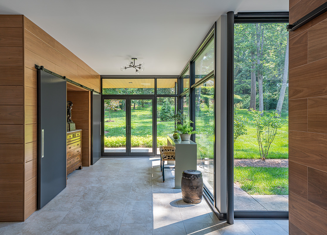 Sliding doors in the foyer don’t obstruct the verdant view. ©Allen Russ / StudioHDP