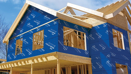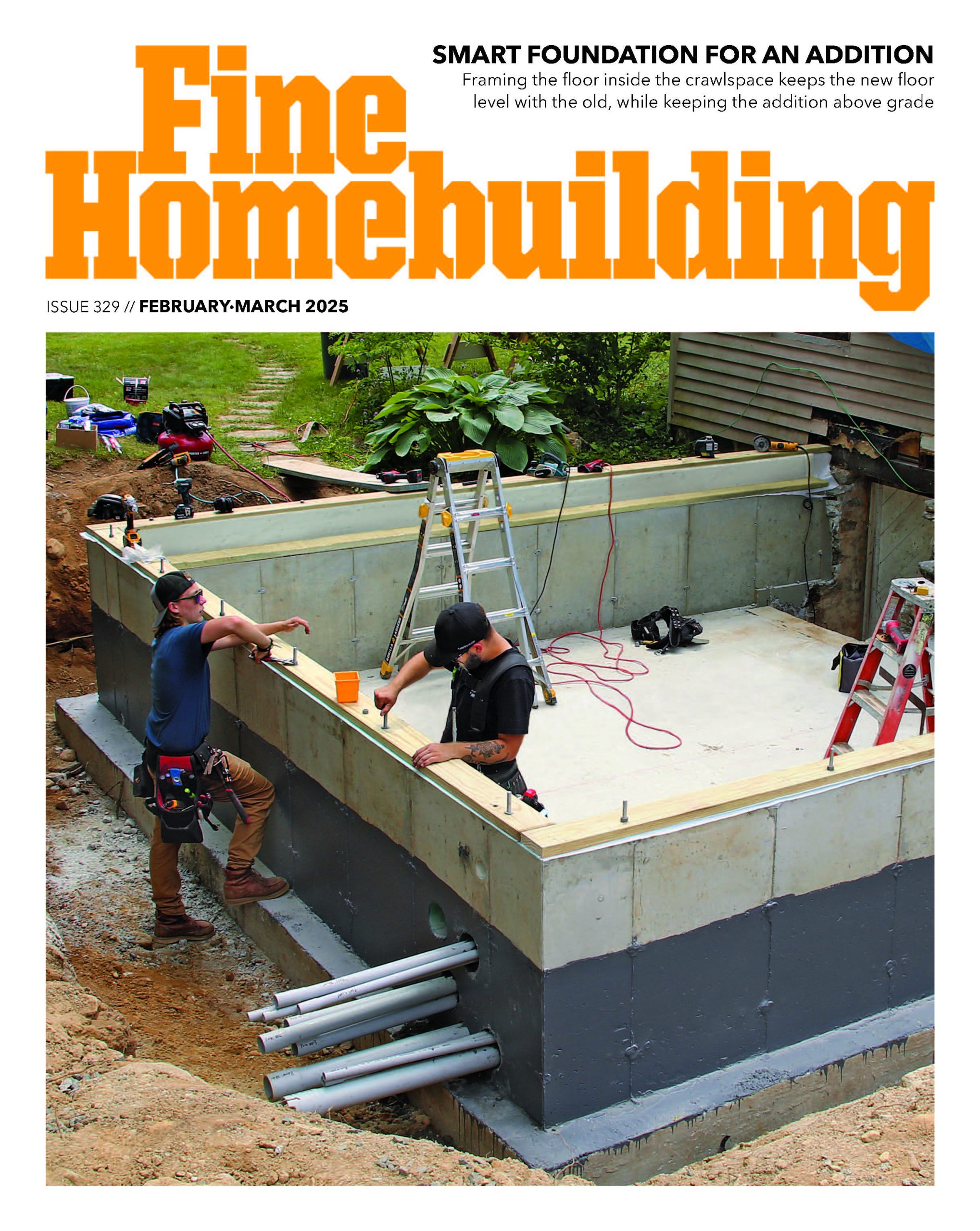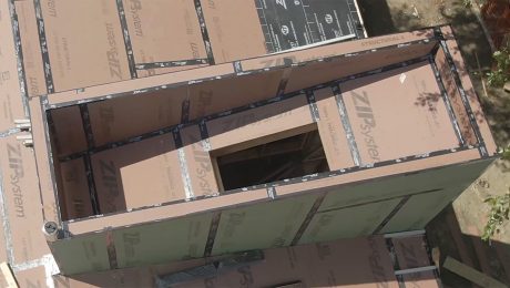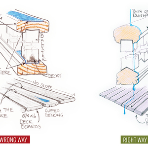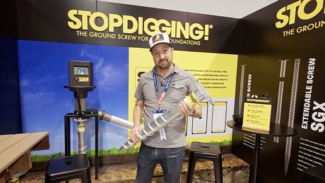 Once materials arrive on-site, you’re ready to begin your installation. Start with a good level so that you can set plumb, and locate that plumb line at the correct dimension out from the exterior. We have a 6×6 structure inside, but the outside corners are almost 10×10. So even though this looks offset, it’s very intentionally centered on that exterior plane. Once you’ve established where that location is, you can even place your level on the picket provided by Feeney to make sure that you are again plumb. Then drill holes for all of your lags at the 3-in. centers already established on the picket.