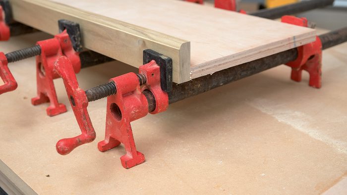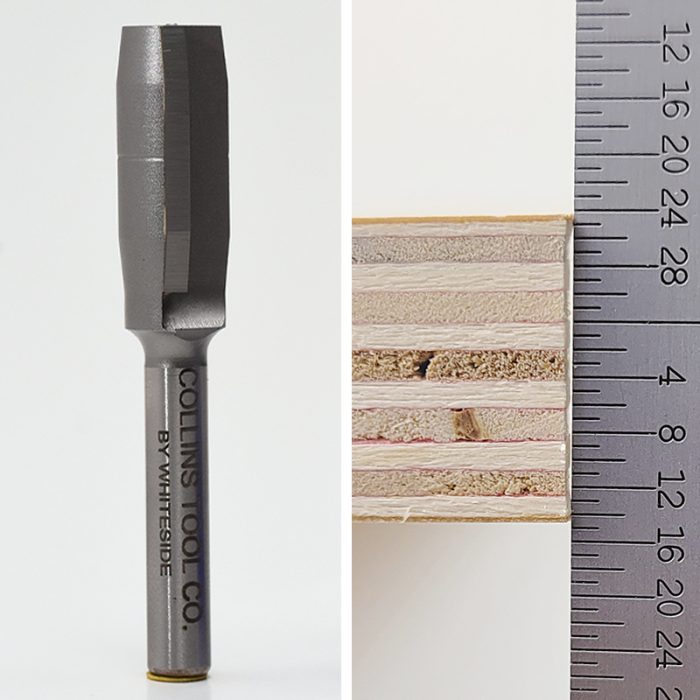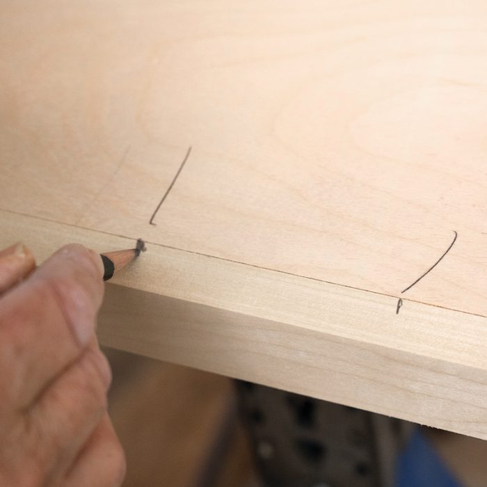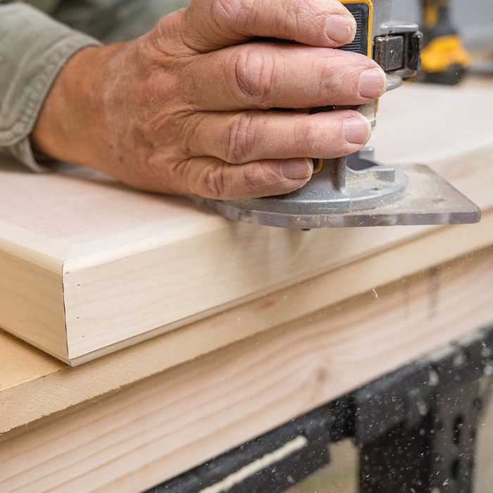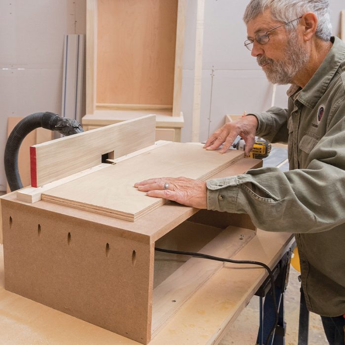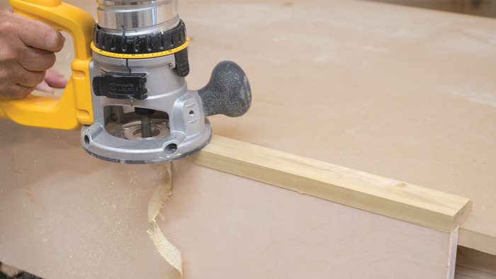 Prep the Plywood: When making tops and shelves, I pass edges that receive nosing over a table-mounted plywood prep bit (collinstools.com). The recess it cuts helps nosing and edgebanding fit tight to the plywood.