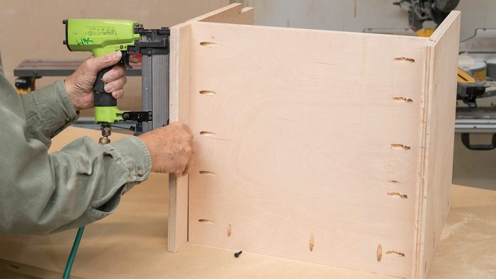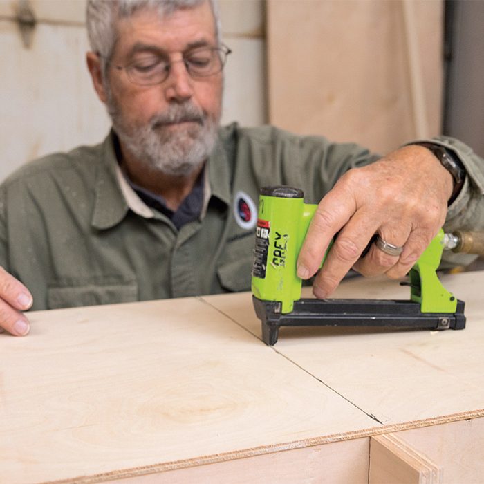 Install the Back: I staple a single piece of 1/4-in.-thick plywood to the back of the seat cabinet with 1/2-in.-crown by 3/8-in.-leg staples. Because the ends of the seat are hidden by the bookshelf cabinets on both ends, the back can be attached without a rabbet or groove.