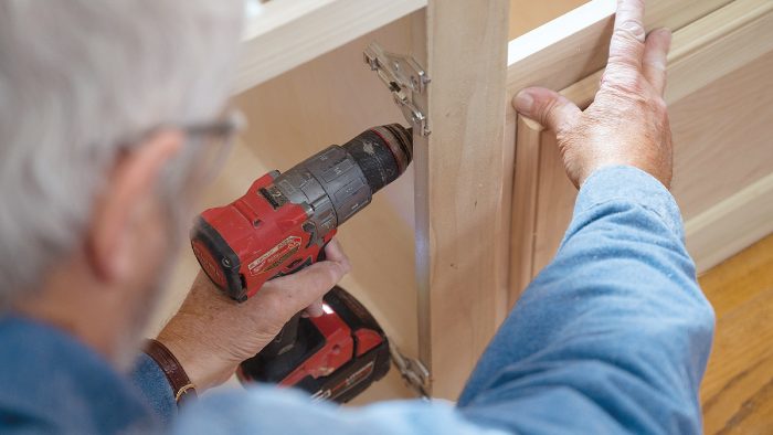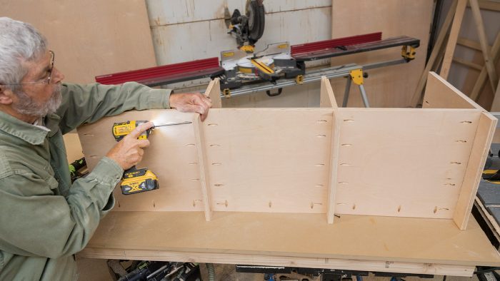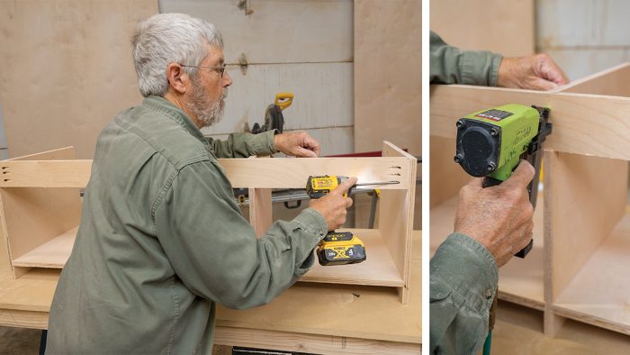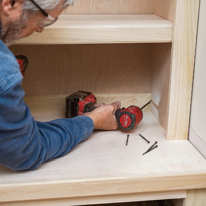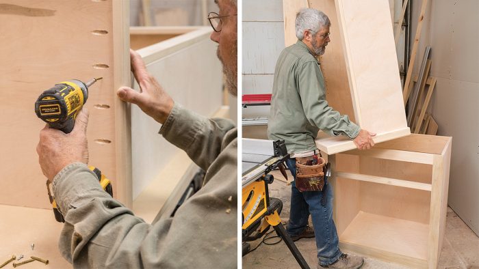 As I mentioned in the first article, I built the tall cabinets in two parts so that they would be easier to assemble and to move to where they’d be installed. When planning any large built-in fixture or cabinet, it’s essential to make sure you can get the components from where they’re being built to their destination. Check door openings, stairway and ceiling heights, and the turning radius in stairs and hallways before you commit to a design. If tight spaces are a concern, consider making the assembly out of smaller cabinets so you can get the parts where they need to go.