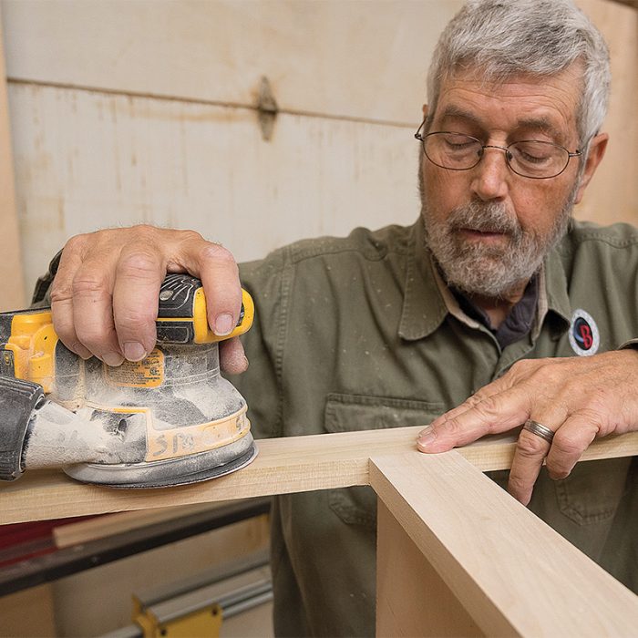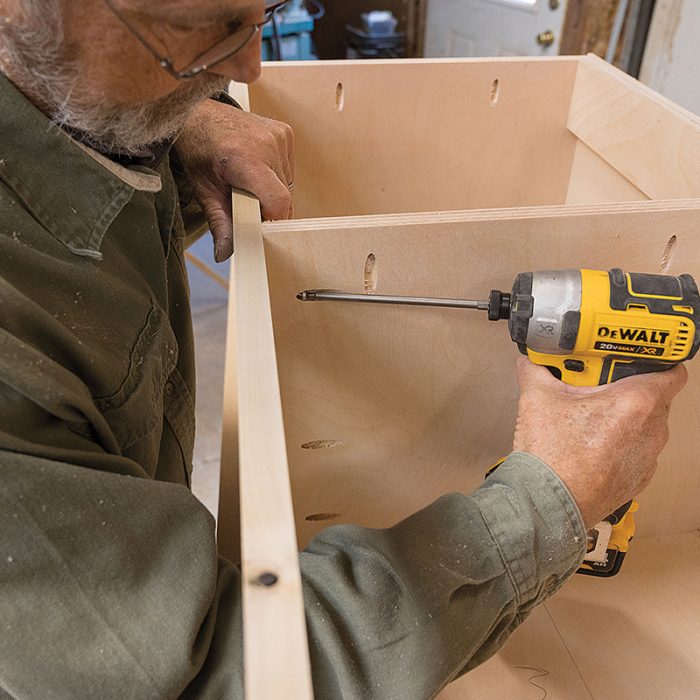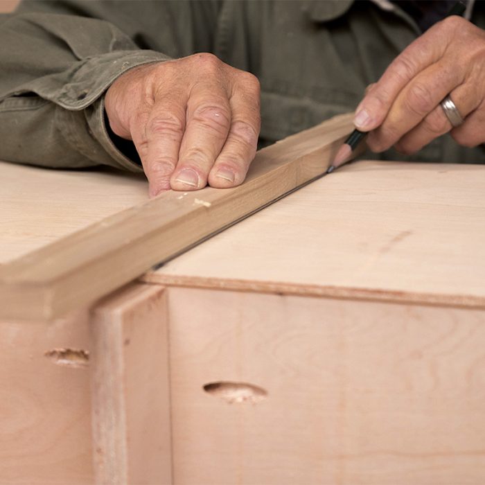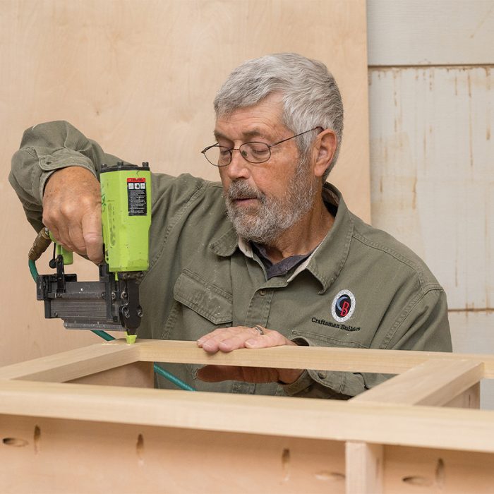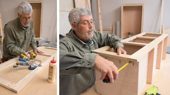 Fasten the Frame: I install the frame with 1/2-in. overhangs on both ends and then fasten it using glue and pocket screws driven into the back of the face frame. I then sand the front of the frame so the stile and rail joints are flush. With the frame complete, I make the drawers using the same methods that I used for making the drawers in the base cabinets (see FHB #332).