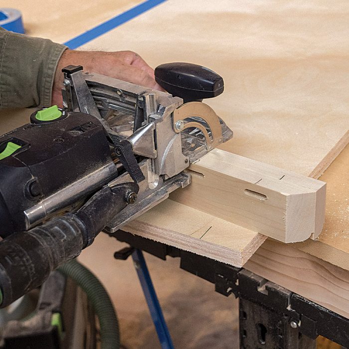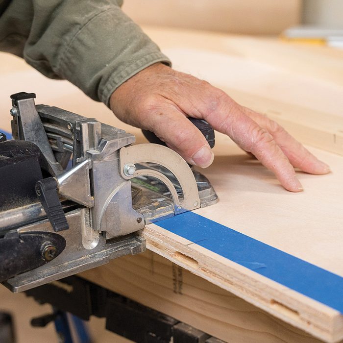 Cut the Tops and Fit the Nosing: I cut the plywood tops 1/4 in. wider and 1/4 in. deeper than the base cabinet and then fit the nosing, starting with the front. I add two layers of tape to the plywood to raise the Domino joiner slightly. This places the nosing slightly proud of the plywood so I can sand it flush later.
