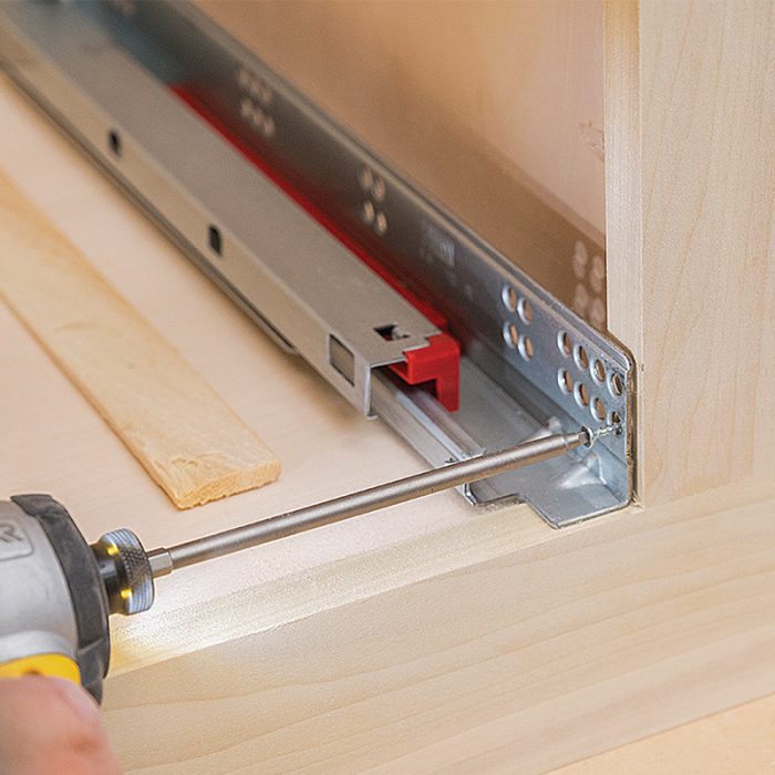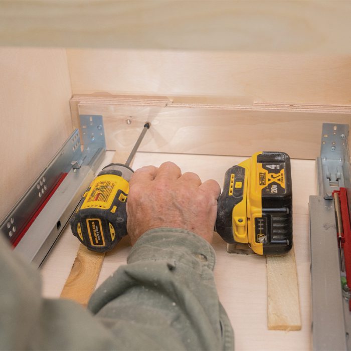 Install Slides: I attach the drawer slides to a piece of plywood, keeping them parallel to the cabinet sides and spaced the width of the drawer box.