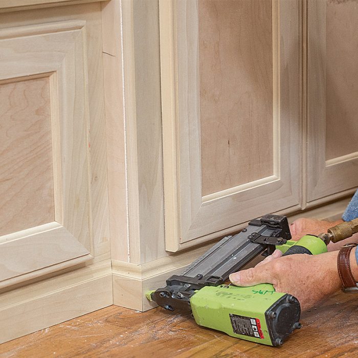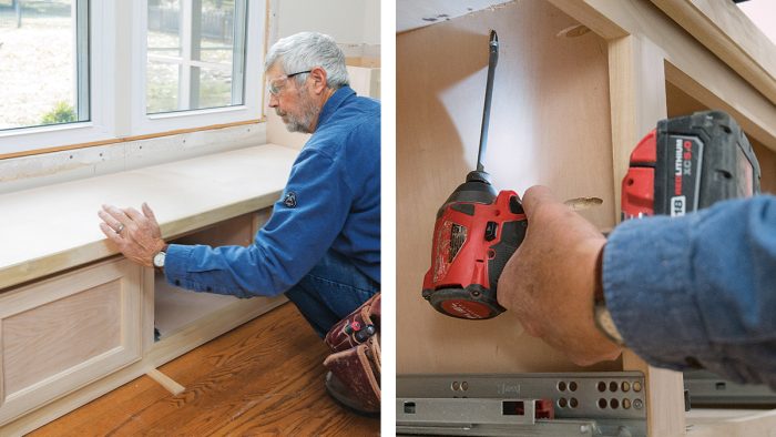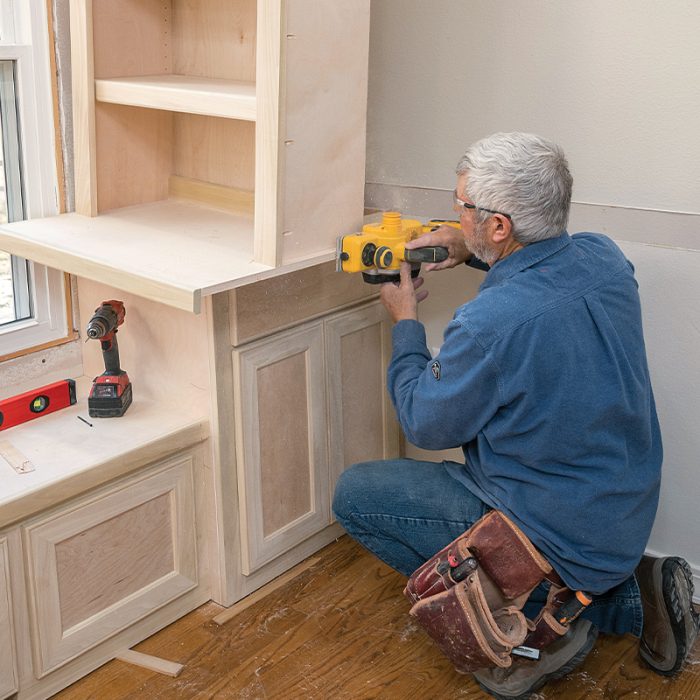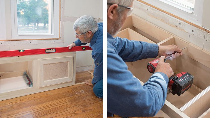 I start the installation by removing the existing base trim, window casing, and chair rail. Next, I install the window seat, centered under the twin window. Its location will determine the layout of the rest of the cabinets. After fitting and fastening the base cabinets, I scribe and fasten the seat top between them.