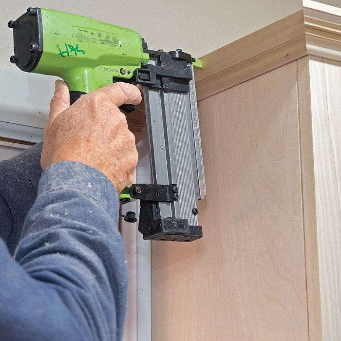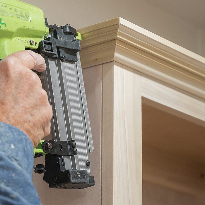 Fit and Fasten Crown: A two-piece poplar crown molding and base trim help give the cabinets and seat their built-in look and feel. I fasten the crown and base with 21-ga. pins, which have holding power near equal to a brad nail but leave a smaller hole. I glue mitered corners to prevent them from opening.