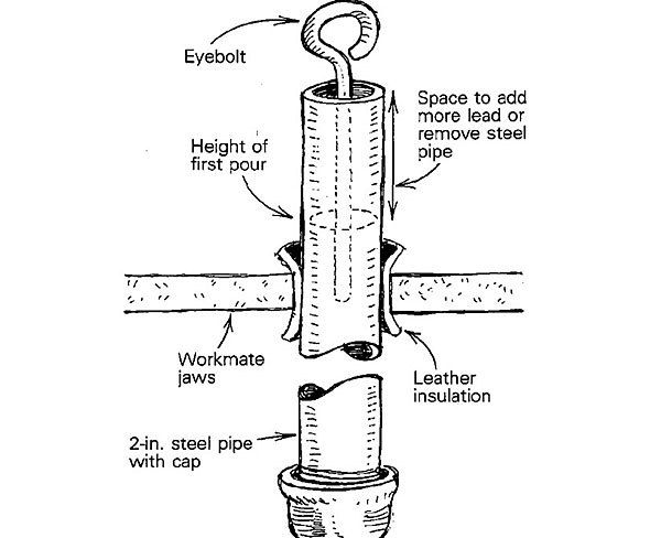 I had a 2-ft. length of 2-in. pipe on hand. As shown in the drawing, I capped one end of it and clamped it upright in the jaws of my Workmate. After figuring the difference in weight between the pipe and the original sash weight, I got out some old lead pipe to make up the difference. Wearing gloves, goggles and a respirator, I melted the lead in a plumber’s crucible and carefully poured it into my steel pipe. I did this outdoors, and protected the area under the pipe with some firebrick to prevent any spills from causing a fire. Once the lead was within a few inches from the top of the pipe, 1 inserted a 6-in. eyebolt and held it steady until the molten lead cooled enough to set up. The two weights ended up weighing virtually the same amount, but if I’d needed to adjust the new one, I could have added a little more lead to the space at the top of the pipe, or removed some of the pipe to trim it down a bit.