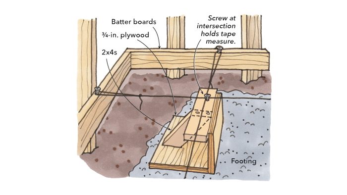 It’s made from two pieces of 3/4-in. plywood and a couple 2x4s. I built it at a height just shorter than the top of the batter boards so it wouldn’t interfere with the strings. I secured the rig to the footing with masonry screws and placed a screw right at the intersection of the strings to hold the tape.
