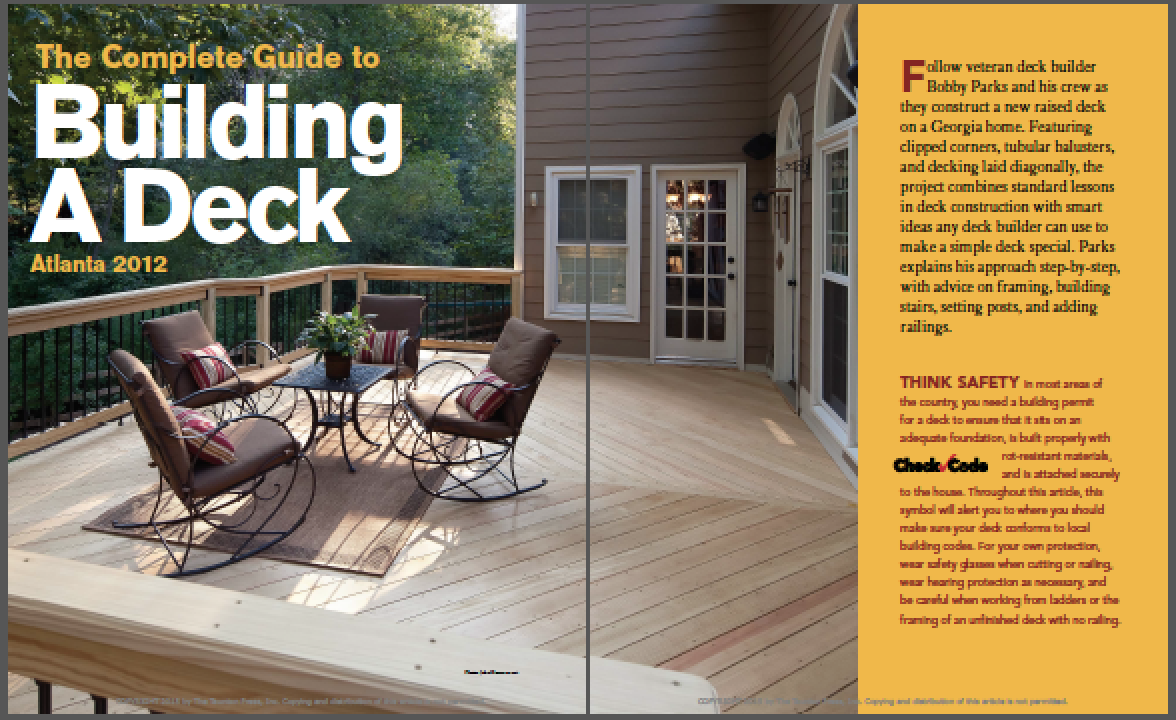 Synopsis: Follow veteran deck builder Bobby Parks and his crew as they construct a new raised deck on a Georgia home. Featuring clipped corners, tubular balusters, and decking laid diagonally, the project combines standard lessons in deck construction with smart ideas any deck builder can use to make a simple deck special. Parks explains his approach step-by-step, with advice on framing, building stairs, setting posts, and adding railings.