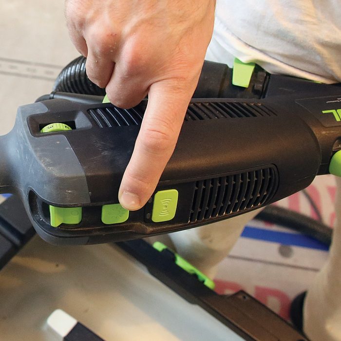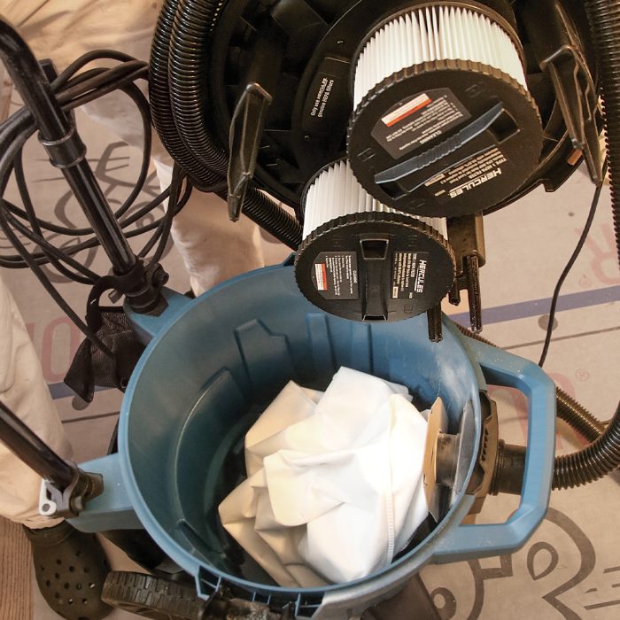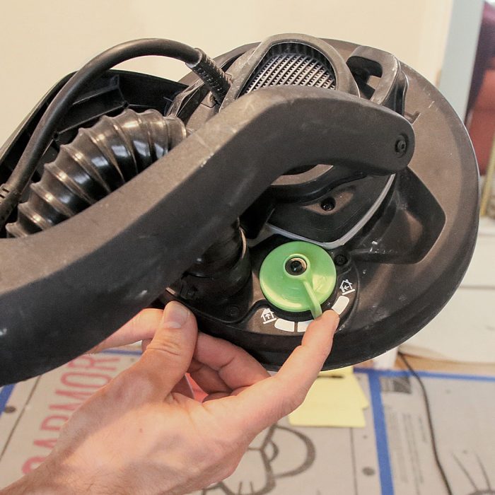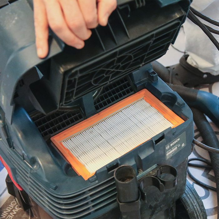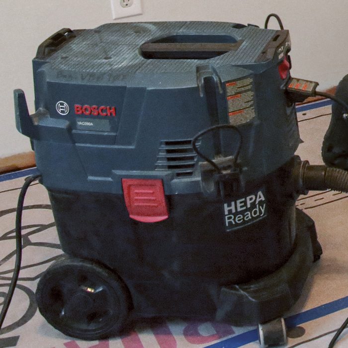 The Bosch dust extractor has intuitive controls, and you can dial back the motor speed when you’re using it for dust extraction with a high-draw tool on a 15-amp circuit to keep the circuit from overloading. The rectangular pleated filter is in a compartment separate from the main collection bin and uses mechanical “thumping” to clean the filter.