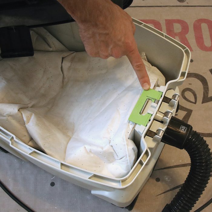 The Planex comes with its own high-flex hose that connects the vac securely to the sander. The filter bag attaches to the inlet with a lock tab that ensures the connection is tight. The motor-speed control prevents blown breakers and reduces suction when maximum power makes the sander stick to the surface.