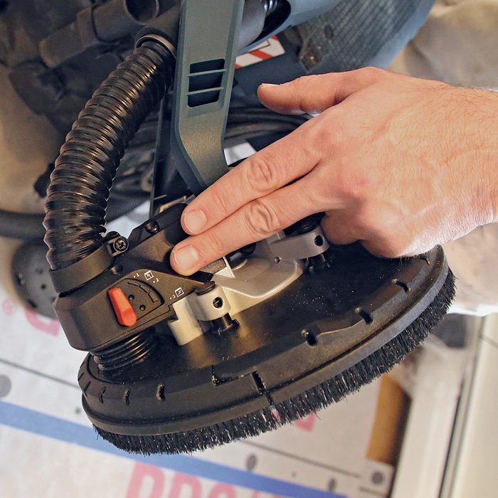 Bosch and Festool use one or two extension tubes to lengthen the center of the tool, providing better balance when they’re extended. Those who have never tried a drywall sander often believe that they must be heavy when used overhead. In actuality, the suction from the dust extractor helps hold the sanding head to walls and ceilings for more efficient sanding and less strain, a feature we refer to as “suction assist.”