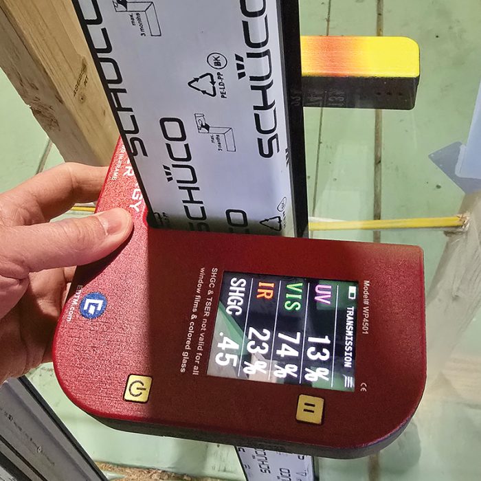 The Window Energy Profiler WP4501 retails for $800. This U-shaped tool fits on either side of an open window sash and tests four different metrics of the glass: UV, VIS, IR, and SHGC. UV, or ultraviolet radiation transmittance, is the ultraviolet radiation moving through the glass that causes flooring and furniture to fade. Lower UV percentages are more desirable.